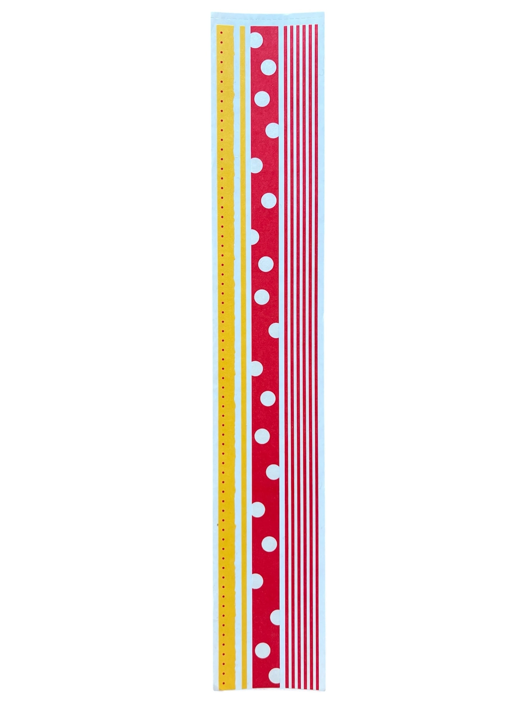 カードづくりにピッタリ、好きな長さにカットして使う、クリスマスカラーの細長いステッカー。トレーシングペーパーのような透ける素材(ヴェラム)になっています。 ステッカーの長さ約30cm。