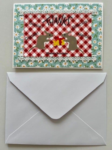 貴重なミセスグロスマンのネズミのステッカーを使った、レースのリボンやお花のペーパーが春らしい母の日にも使えそうなサンキューカード。